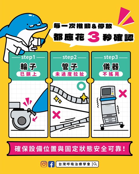 呼吸器與醫療儀器是病人重要的生命維生設備, 任何滑動、 摔落或傾倒, 都可能造成嚴重後果。請務必於每次移動後, 確實踩下固定板、 鎖緊輪子, 避免因病人翻身、 移位、 地震或不慎碰撞, 導致機器拉動、 管路脫落、 設備損壞, 甚至危及病人生命的憾事發生。